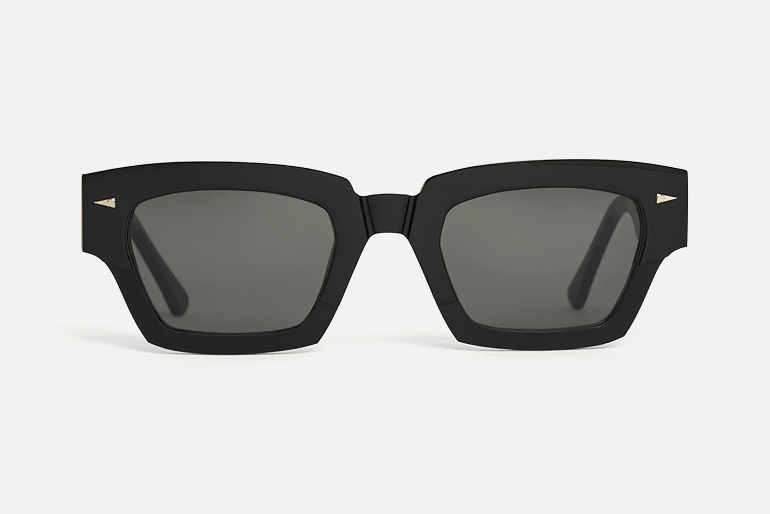 Electroplated 22k gold hinges, custom design temple core, beveled temples, and signature geometric accents.