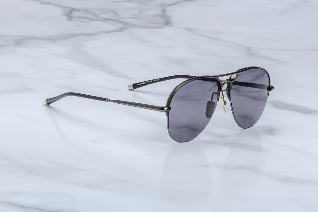 Semi-rimless titanium aviators with a medium fit, featuring arched double-bridge with hairline details and Art Deco-inspired acetate temple tips with domed, handpainted epoxy details.