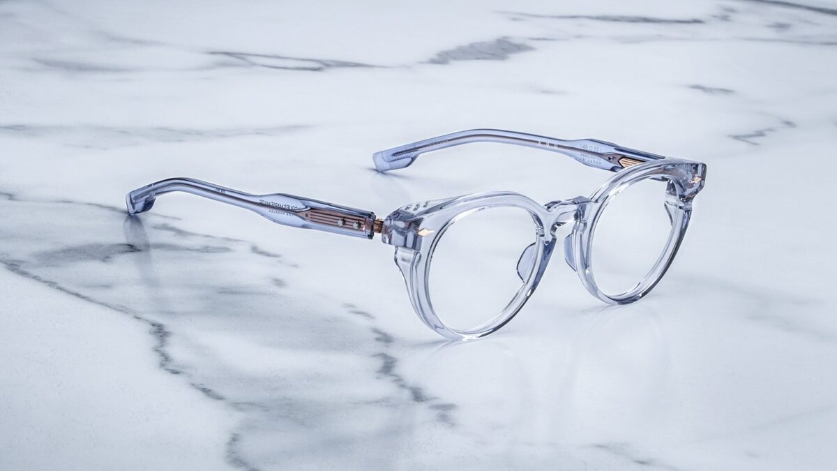 The JMM Arp is a pantoscopic-shaped optical frame with intense volume cut-outs, made of 12MM block acetate and featuring a custom floating hinge system.