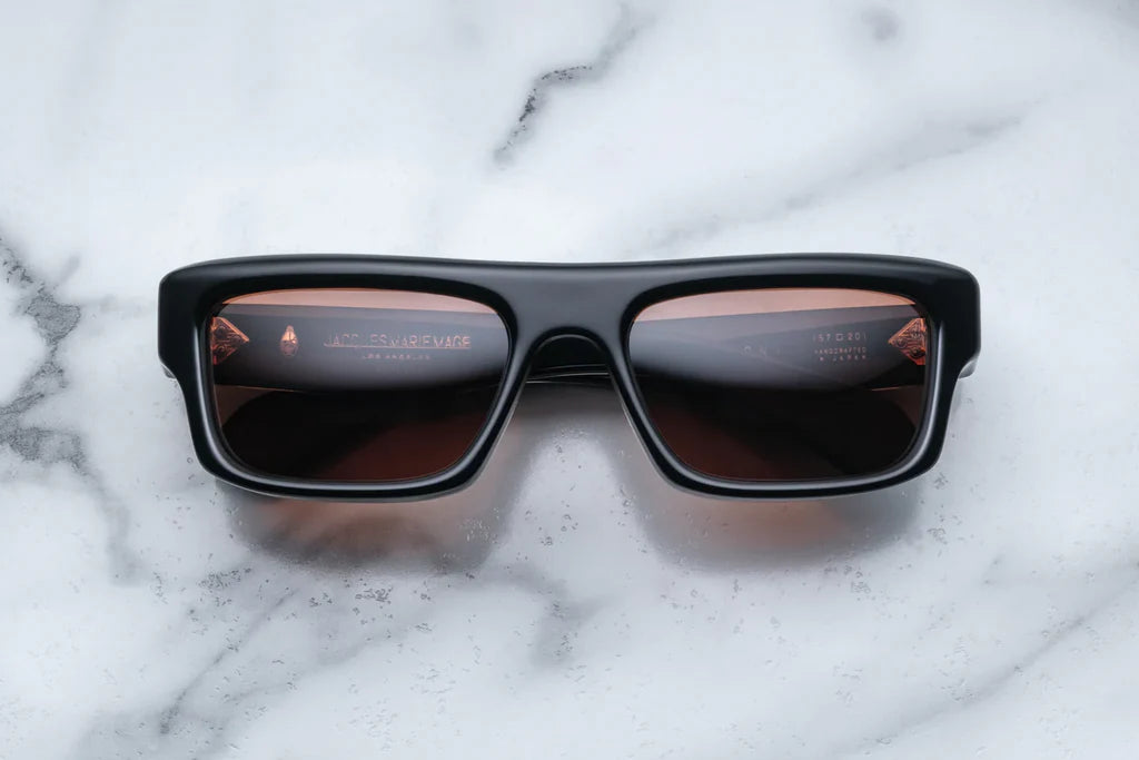 BLACK 8MM CURED CELLULOSE ACETATE FRAME WITH CUSTOM DOUBLE LAMINATED ACETATE TEMPLES FEATURING PRECIOUS METAL HARDWARE AND BROWN LENSES