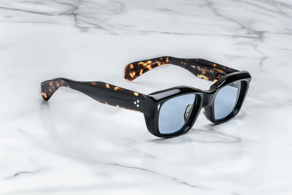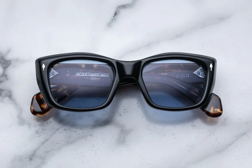 BLACK 10MM CURED CELLULOSE ACETATE FRAME WITH CUSTOM DOUBLE LAMINATED ACETATE TEMPLES FEATURING PRECIOUS METAL HARDWARE AND BLUE LENSES