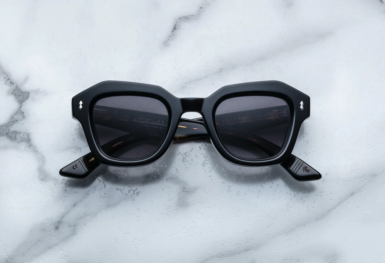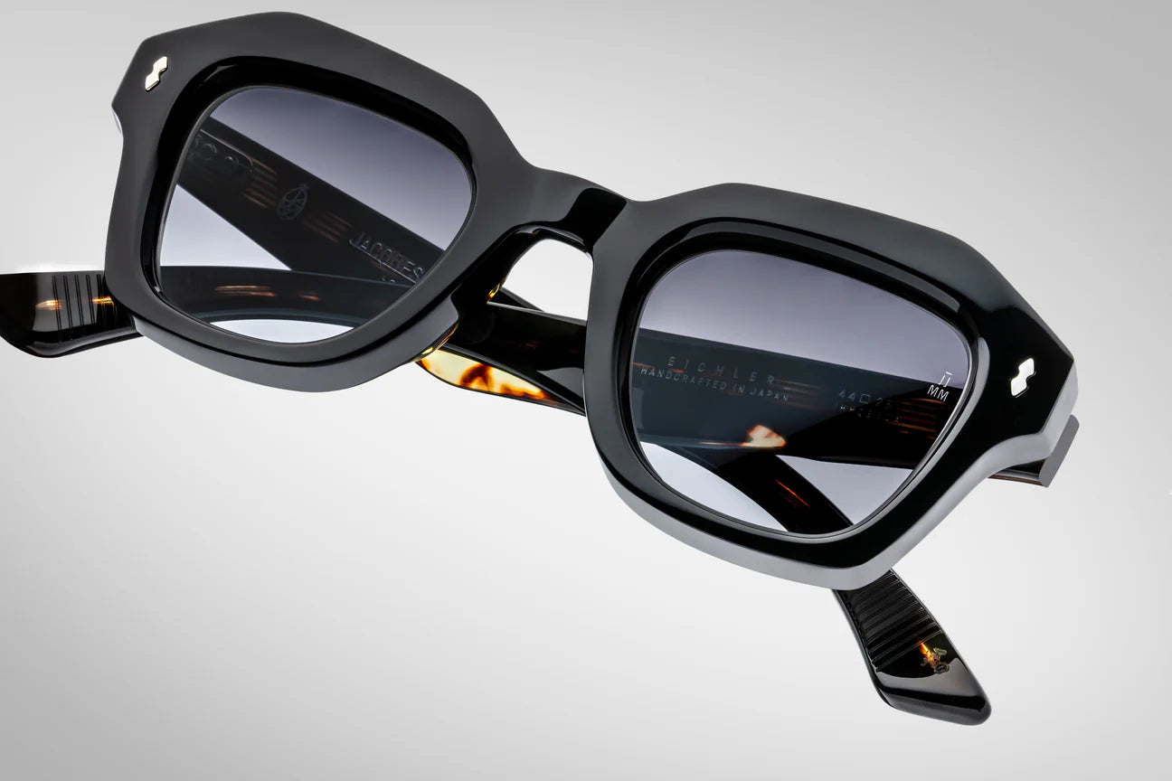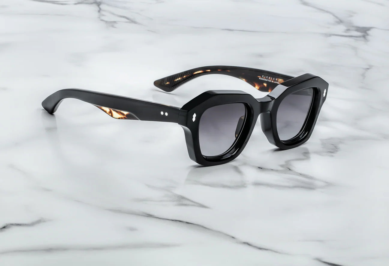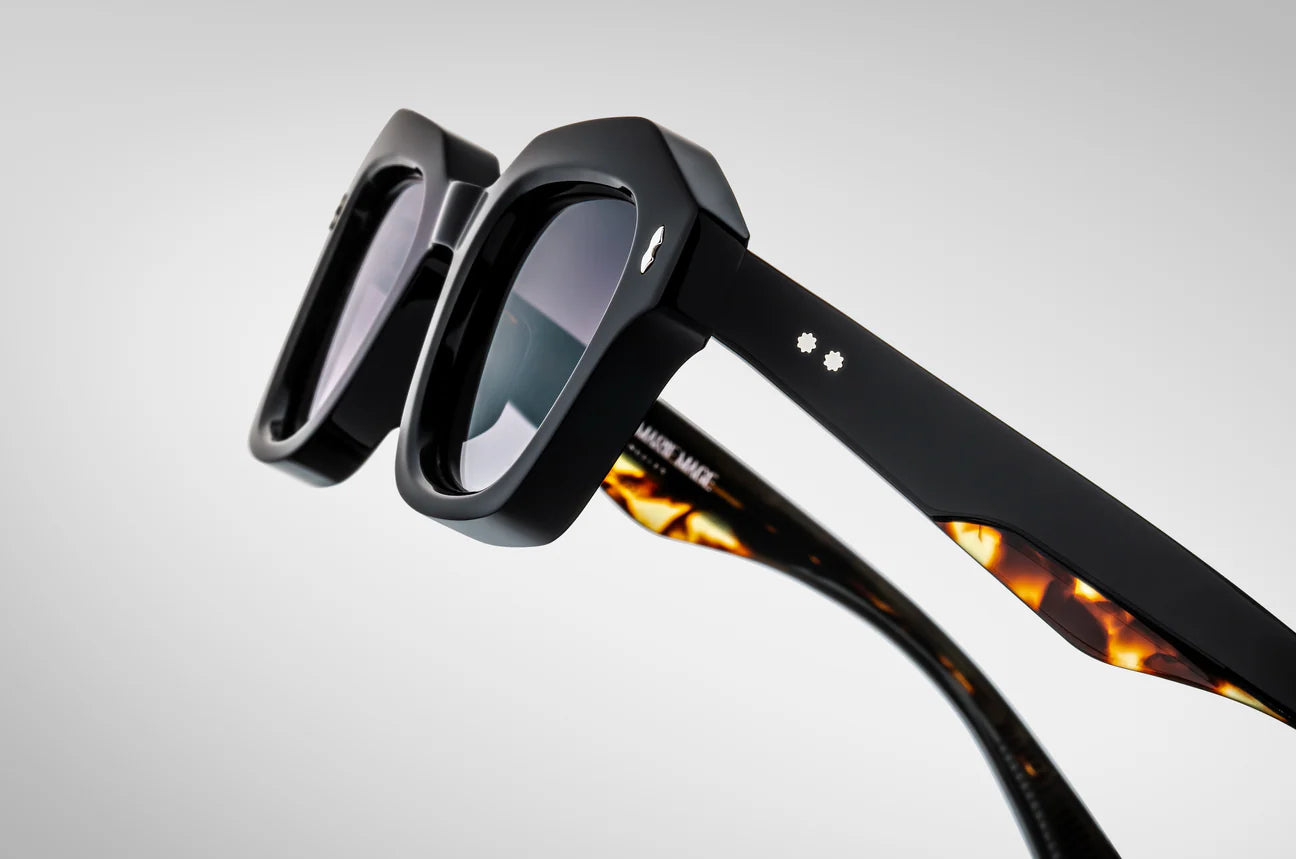 MATERIAL: BLACK 10MM CURED CELLULOSE ACETATE FRAME W/ CUSTOM DOUBLE LAMINATED ACETATE TEMPLES FT. PRECIOUS METAL HARDWARE             HARDWARE: STERLING SILVER - LENS: JET GRADIENT CR39 - HANDCRAFTED IN JAPAN