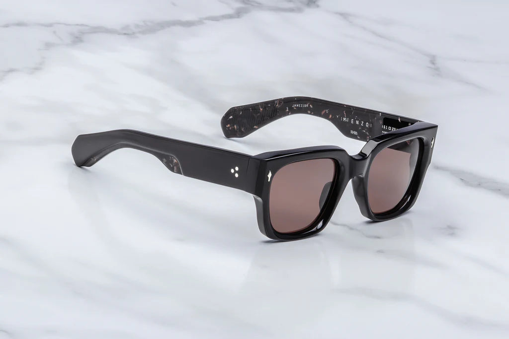 BLACK 10MM CURED CELLULOSE ACETATE FRAME WITH CUSTOM DOUBLE LAMINATED ACETATE TEMPLES FEATURING PRECIOUS METAL HARDWARE AND GREEN CR39 LENSES