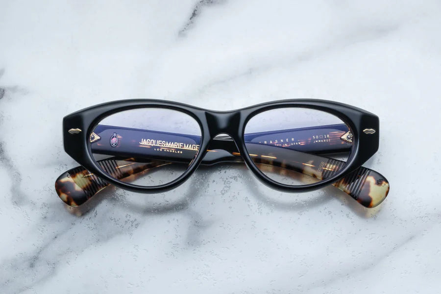 BLACK 10MM CURED CELLULOSE ACETATE FRAME WITH CUSTOM DOUBLE LAMINATED ACETATE TEMPLES FEATURING PRECIOUS METAL HARDWARE AND LIGHT GREY LENSES