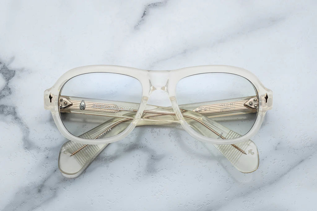 YELLOW 10MM CURED CELLULOSE ACETATE FRAME WITH CUSTOM DOUBLE LAMINATED ACETATE TEMPLES FEATURING PRECIOUS METAL HARDWARE AND SUPERLIGHT BLUE LENSES