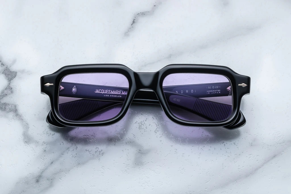 BLACK 10MM CURED CELLULOSE ACETATE FRAME WITH CUSTOM DOUBLE LAMINATED ACETATE TEMPLES FEATURING PRECIOUS METAL HARDWARE AND PURPLE LENSES