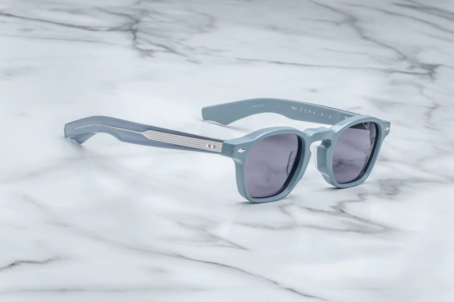 BLUE 10MM CURED CELLULOSE ACETATE FRAME WITH CUSTOM ACETATE TEMPLES FEATURING PRECIOUS METAL HARDWARE AND GREY LENSES